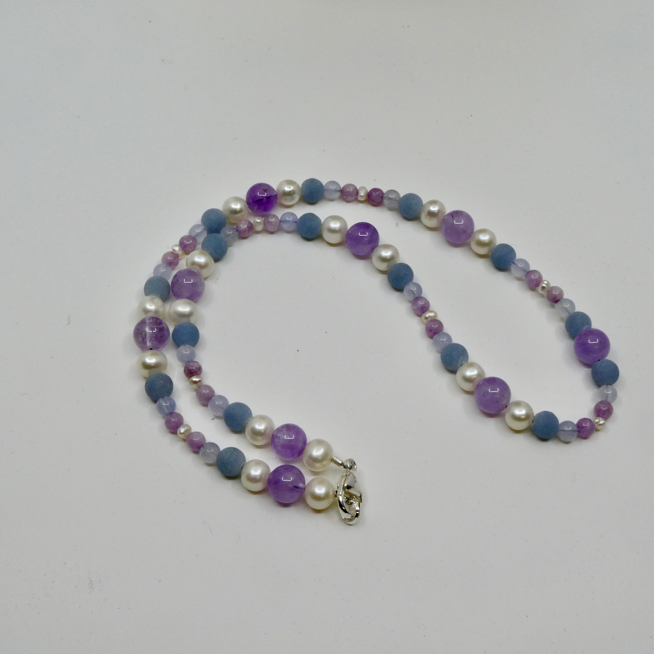 Angelith - Amethyst - Kunzit - Chalcedon- Perl Design Edelsteinkette