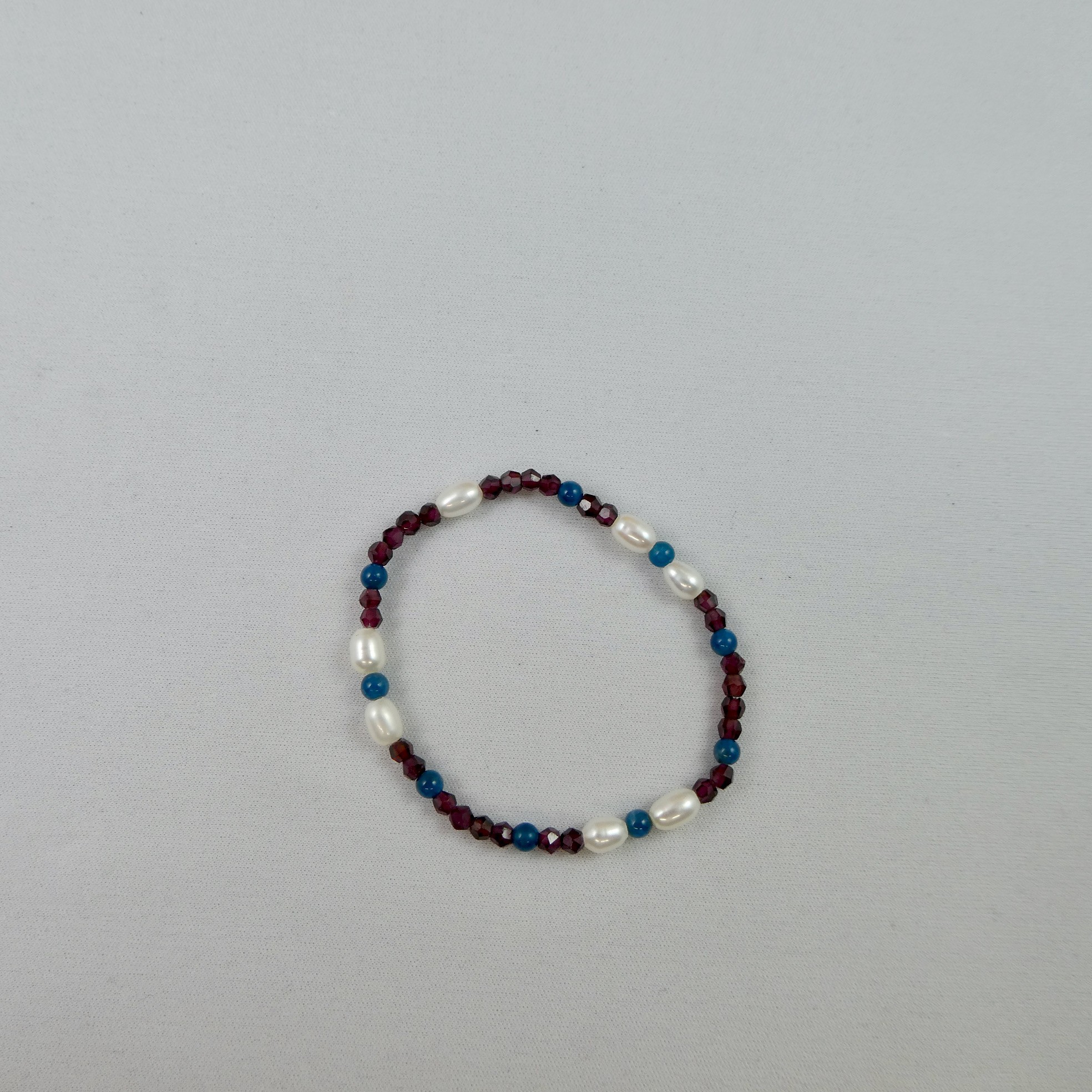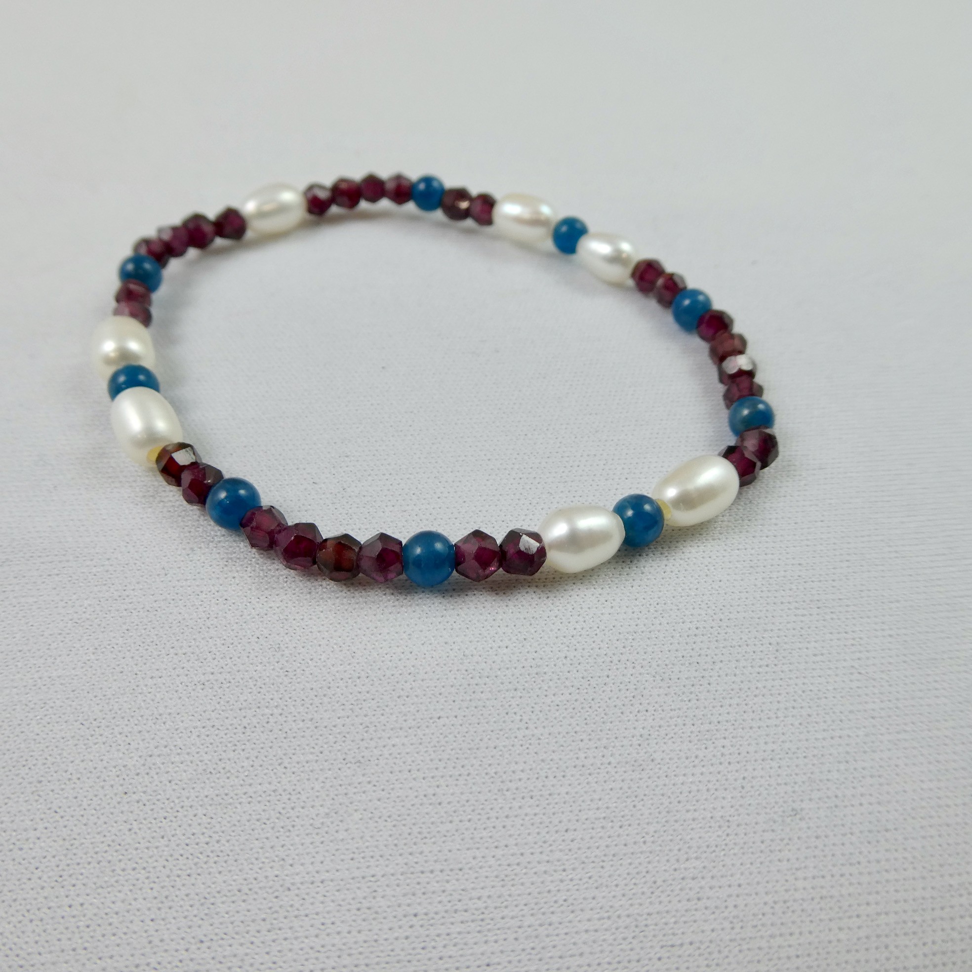 Armband mit Granat - Almandin Kugeln facettiert 3,5mm, Apatit blau Kugeln 4mm und Süßwasser Zuchtperlen 7x5mm, Länge 18cm, ausgesuchte Edelsteine auf Elastikfaden aufgefädelt