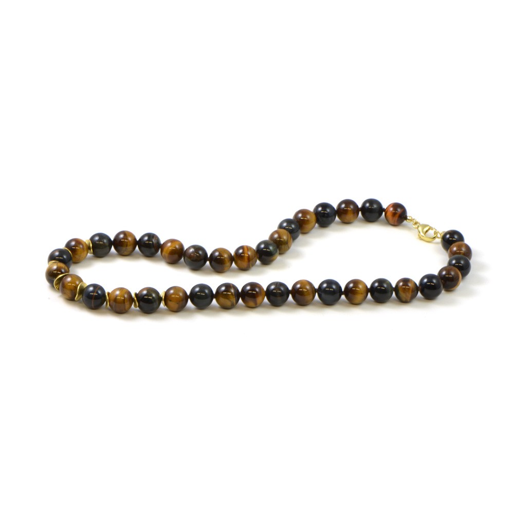 Halskette Tigerauge und Falkenauge Kugeln 12 mm, Wellen Silber vergoldet ca. 8x0,5 mm, Länge 50 cm mit Schließe Silber vergoldet Karabiner 16 mm