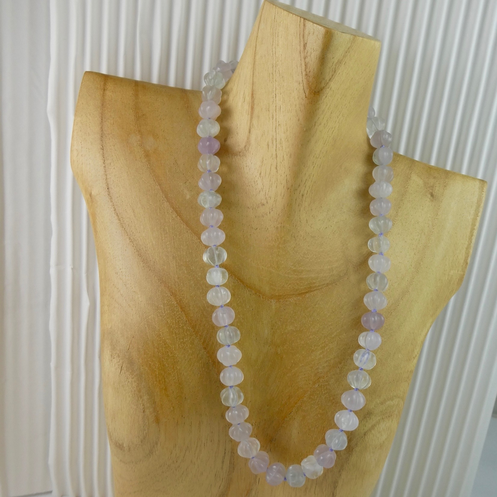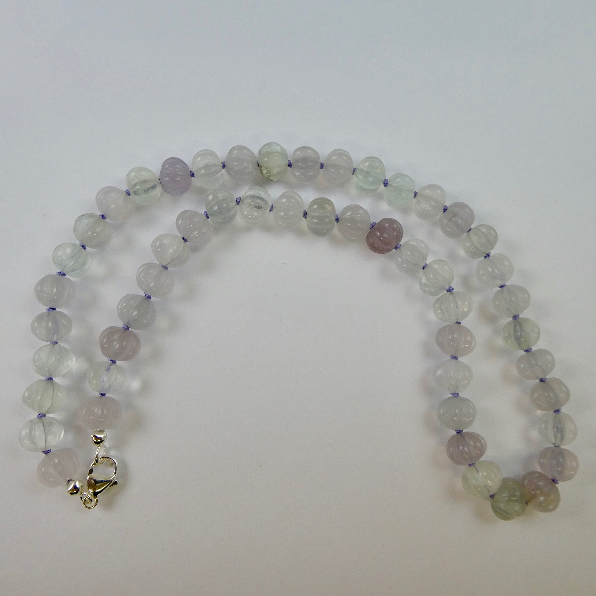 Fluorit Fliederfarben Edelsteinkette, rosa-grün pastellisch, Lampions graviert 9x6mm, 47,5cm Länge , mit Silber Karabinerschließe 11mm, auf Perlseide hand geknotet