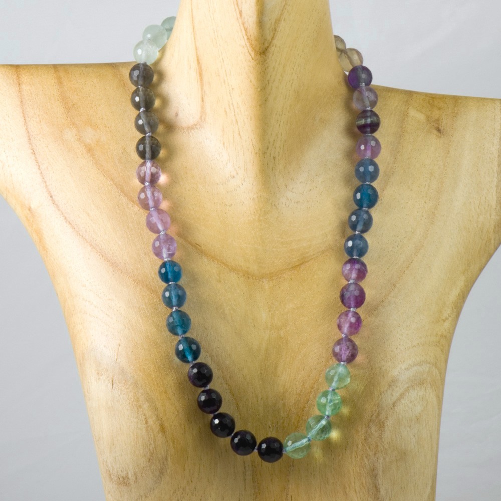 Halskette Fluorit bunt Kugel facettiert 10 mm, auf Perlseide geknotet, Länge 46 cm mit Schließe Silber vergoldet Karabiner 16 mm