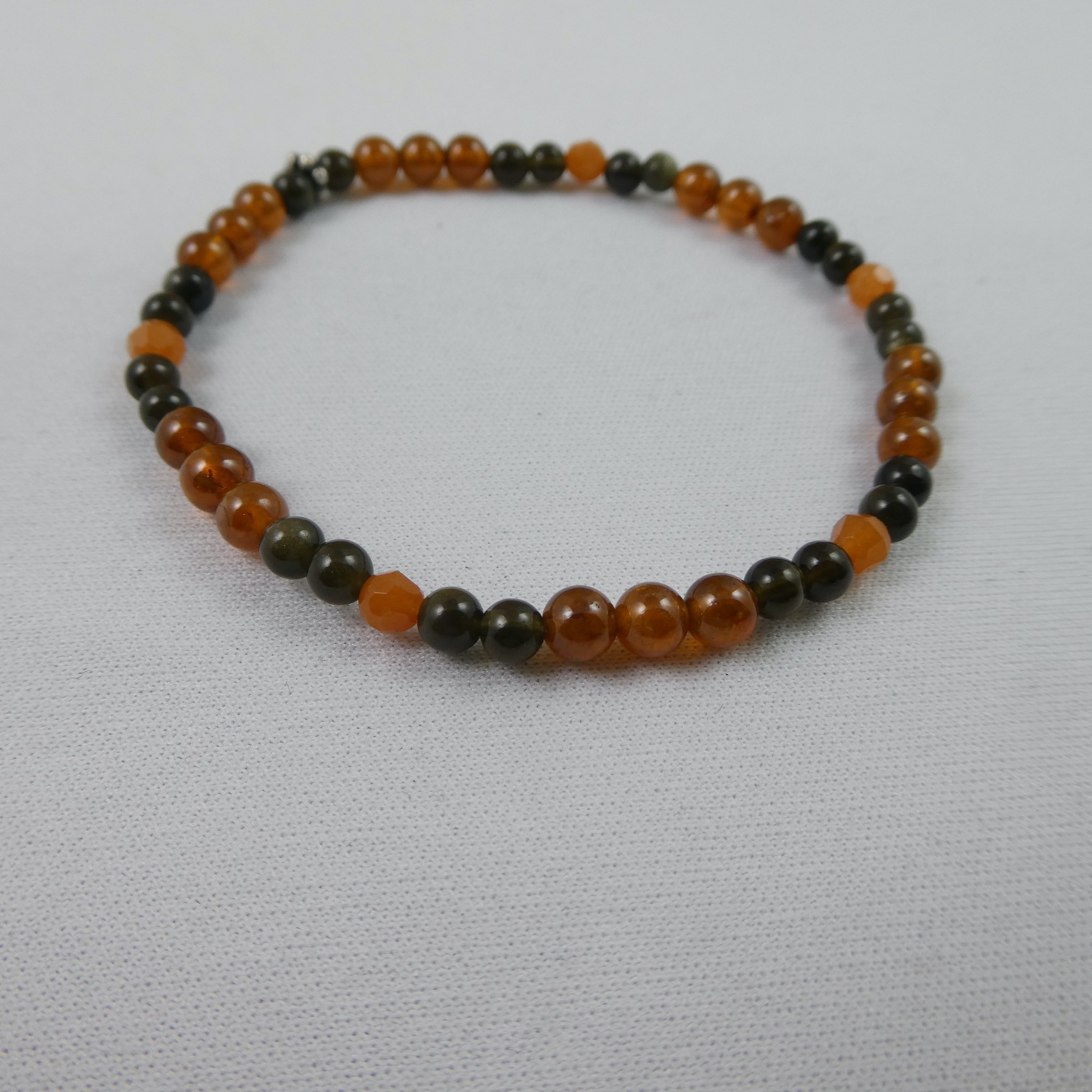 Armband mit Hessonit Granat orange Kugeln 5mm, Obsidian schwarz Kugeln 4mm, Avneturin orange Kugeln facettiert 4mm, + Silberteil, Länge 18,5cm, ausgesuchte Edelsteine auf Elastikfaden aufgefädelt