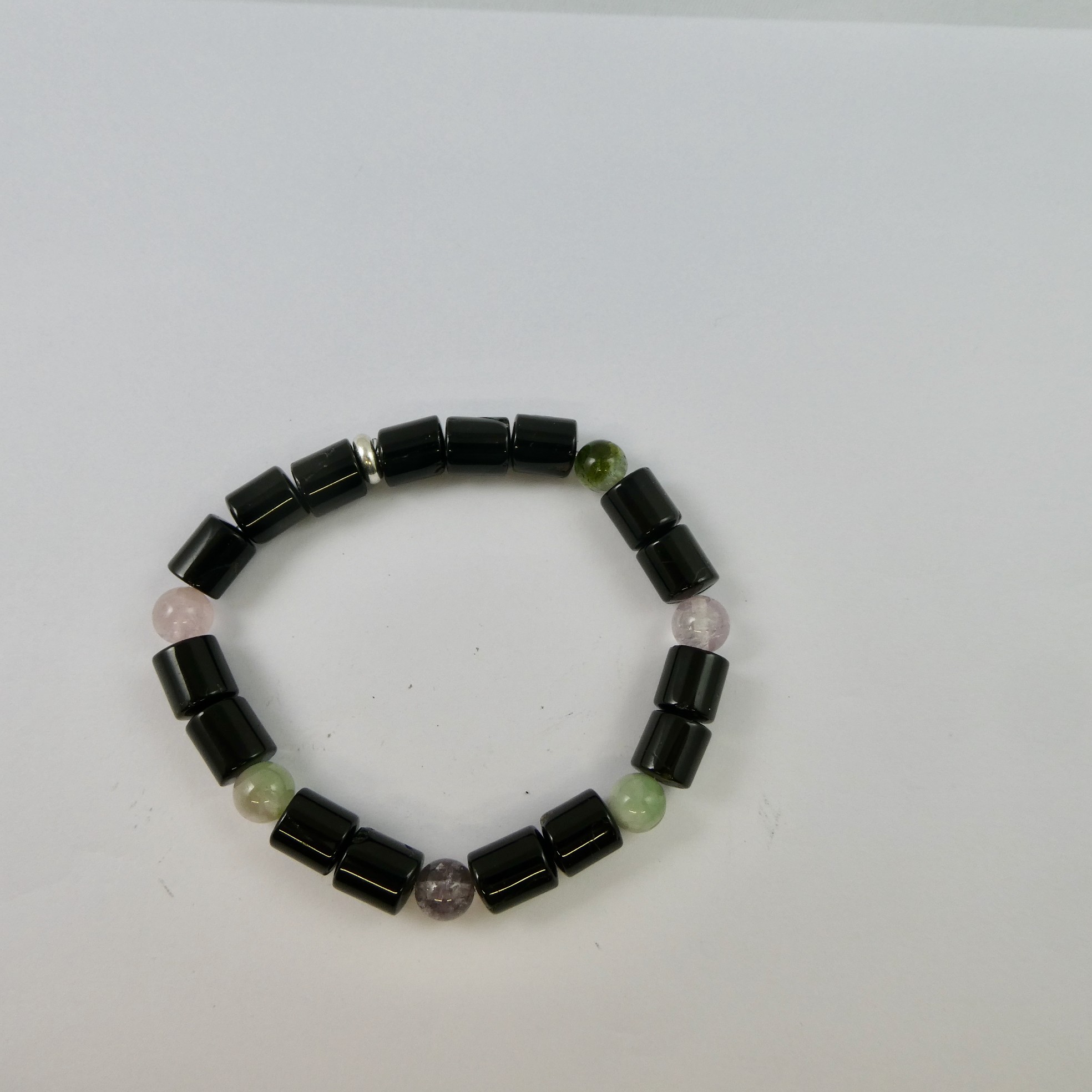 Turmalin schwarz Walzen ca 9x8mm und Turmalin ausgesuchte Kugeln in rosa und grün 7mm, mit Silberteil, Länge 18,5cm, auf Elastikfaden gefädelt